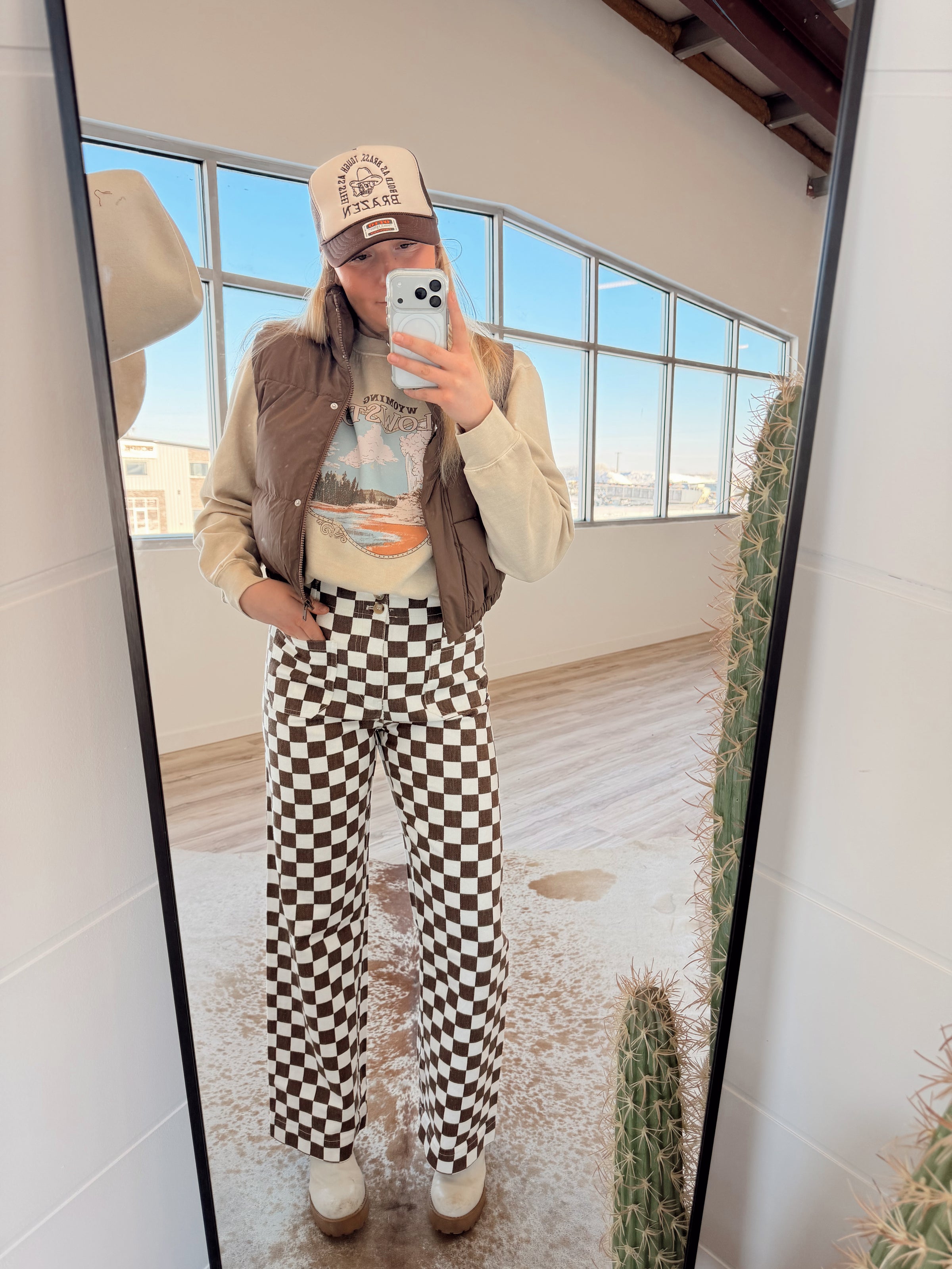 Bold, western, and a little bit retro — the Canyon Coffee Check Flare is made for the cowgirl who isn’t afraid to stand out. Featuring a rich chocolate and cream checkerboard print, these high-rise pants bring vintage rodeo vibes with a modern, flattering fit.