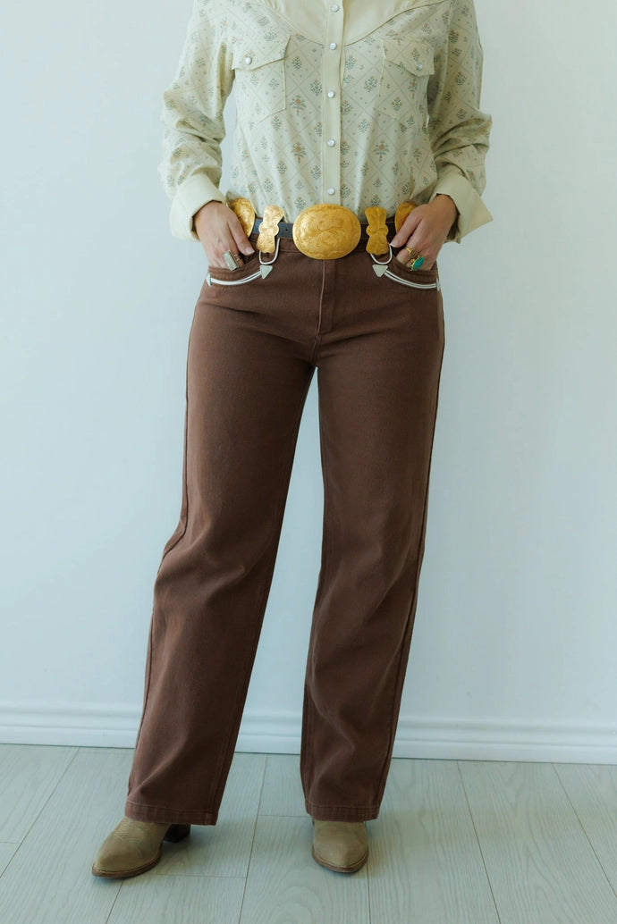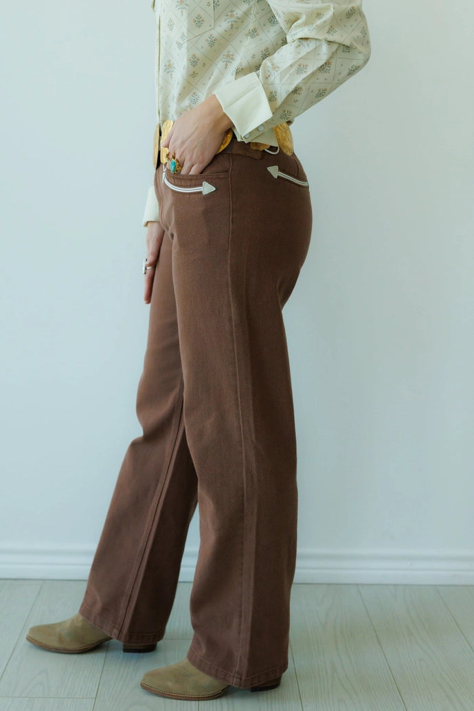 Soft, structured, and Western to the core, the Mesa Trail Straight-Legs are made for the woman who loves classic ranch styling with a refined twist. The warm chocolate-brown denim offers a rich, earthy alternative to everyday blues, while the crisp white piping and arrow-tipped pockets add that unmistakable cowgirl character. With a flattering straight-leg cut and just the right amount of stretch, these pants are perfect for long days, golden hours, and everywhere the trail leads.
